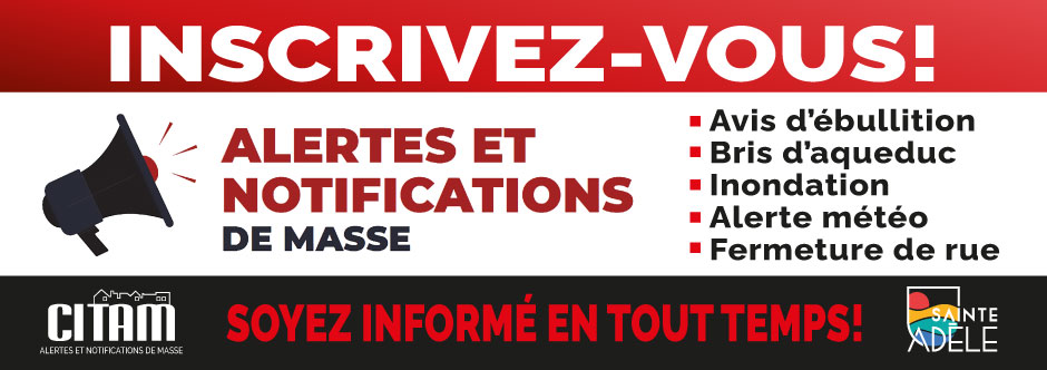Inscrivez-vous à CITAM, notre système informatisé d'alerte et de mobilisation en cas de sinistre. Ce système permet de rejoindre rapidement nos citoyens lors de situations d'urgence, en plus de les informer sur des situations spécifiques.