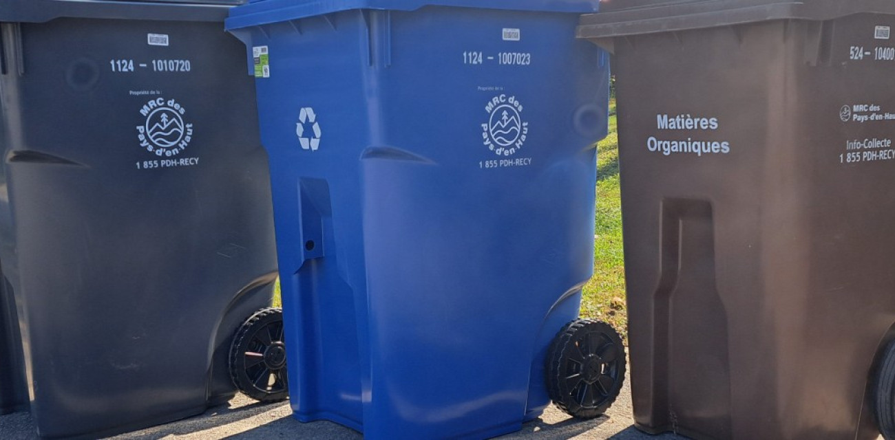 Pour toute question ou demande en lien avec les bacs bleus, bruns et noirs (bacs non vidés, brisés ou nouvelles constructions) ou les encombrants, veuillez joindre la MRC des Pays-d'en-Haut :