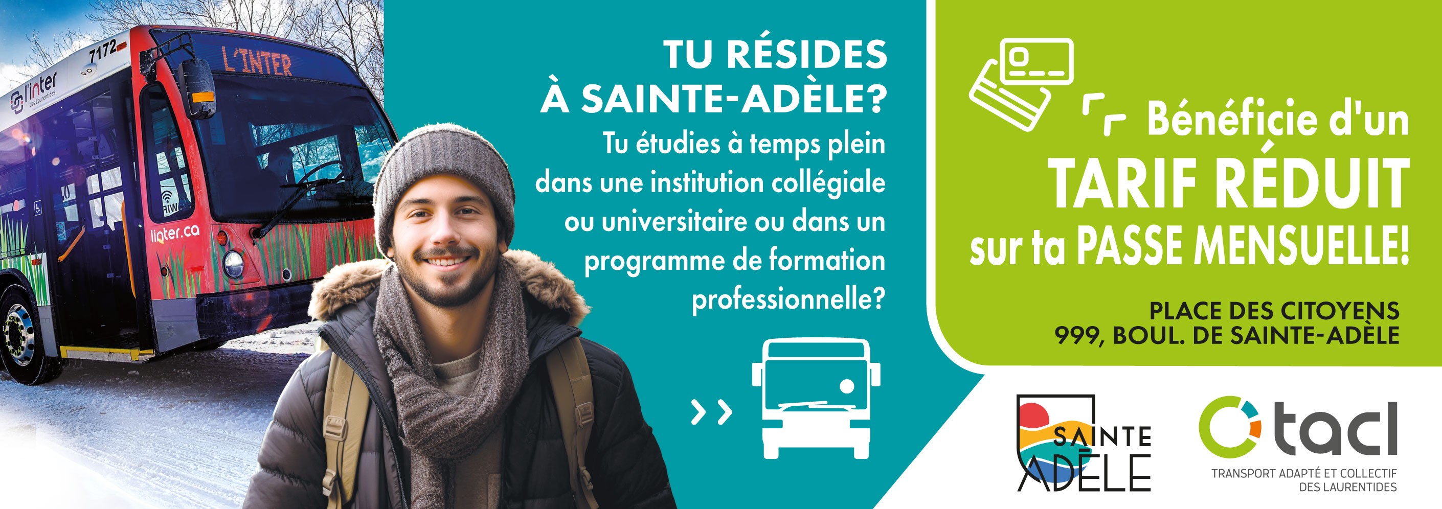 En offrant ce tarif réduit pour le transport collectif, la Ville de Sainte-Adèle souhaite faciliter l’accès des étudiants adélois aux établissements d’enseignement post-secondaire et professionnel de la région.